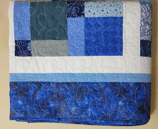 For Christmas, I bought her all the fabric she should need to make the pieced blocks and borders for this quilt too.  All in shades of blue of course.
